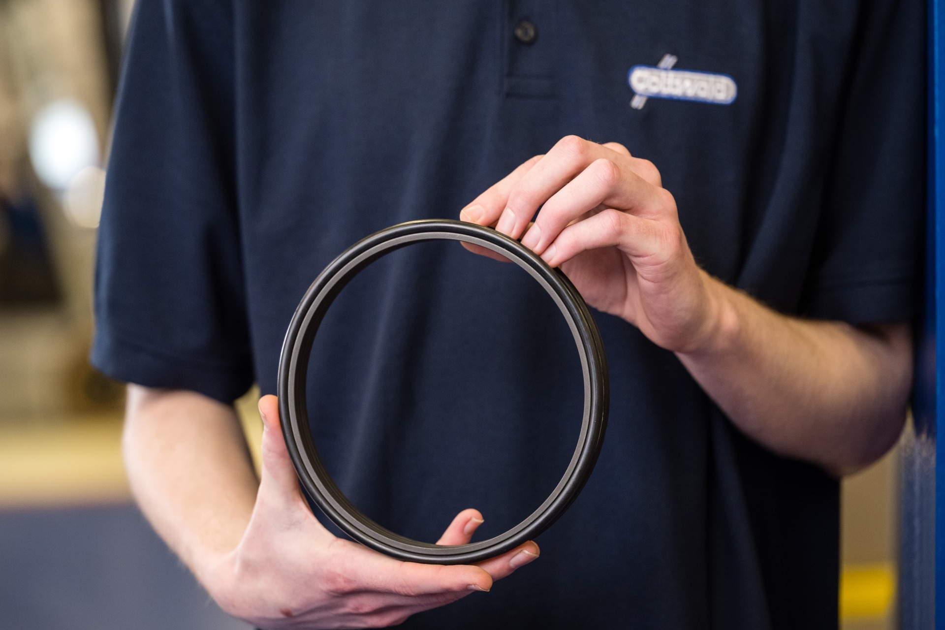 Ein Mitarbeiter der Franz Gottwald GmbH + Co. KG steht mit einem O-Ring vor einem Gabelstapler in der Werkhalle. Dichtungen von Dichta.